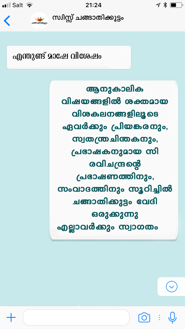 എഴുപത് എൺപത് കാലഘട്ടങ്ങളിൽ നാട്ടിൻപുറത്തെ ചുറ്റുവട്ടത്തുള്ളവർ ഒത്തുകൂടി, സന്തോഷത്തോടെ ചിലവിട്ട സായാഹ്ന വെടിവട്ട സദസ്സുപോലെ, മാതൃഭാഷാസ്നേഹത്തിന്റെ അമ്മിഞ്ഞപ്പാൽ മധുരം, മനസ്സിൽ കാത്തു സൂക്ഷിക്കുന്ന സ്വിസ്സ്മലയാളികൾ, വാട്ട്സപ്പ് നവയുഗ മീഡിയ വഴി ഒത്തുചേർന്ന ഒരു ചെറുകൂട്ടമാണ് സ്വിസ്സ് ചങ്ങാതിക്കൂട്ടം